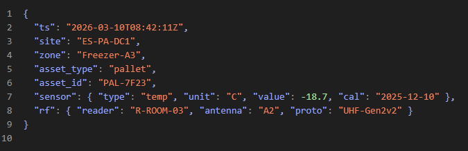 • Middleware: map epc → asset_id, enrich with location and provenance (reader/antenna, firmware), and route to WMS/QMS/ERP.